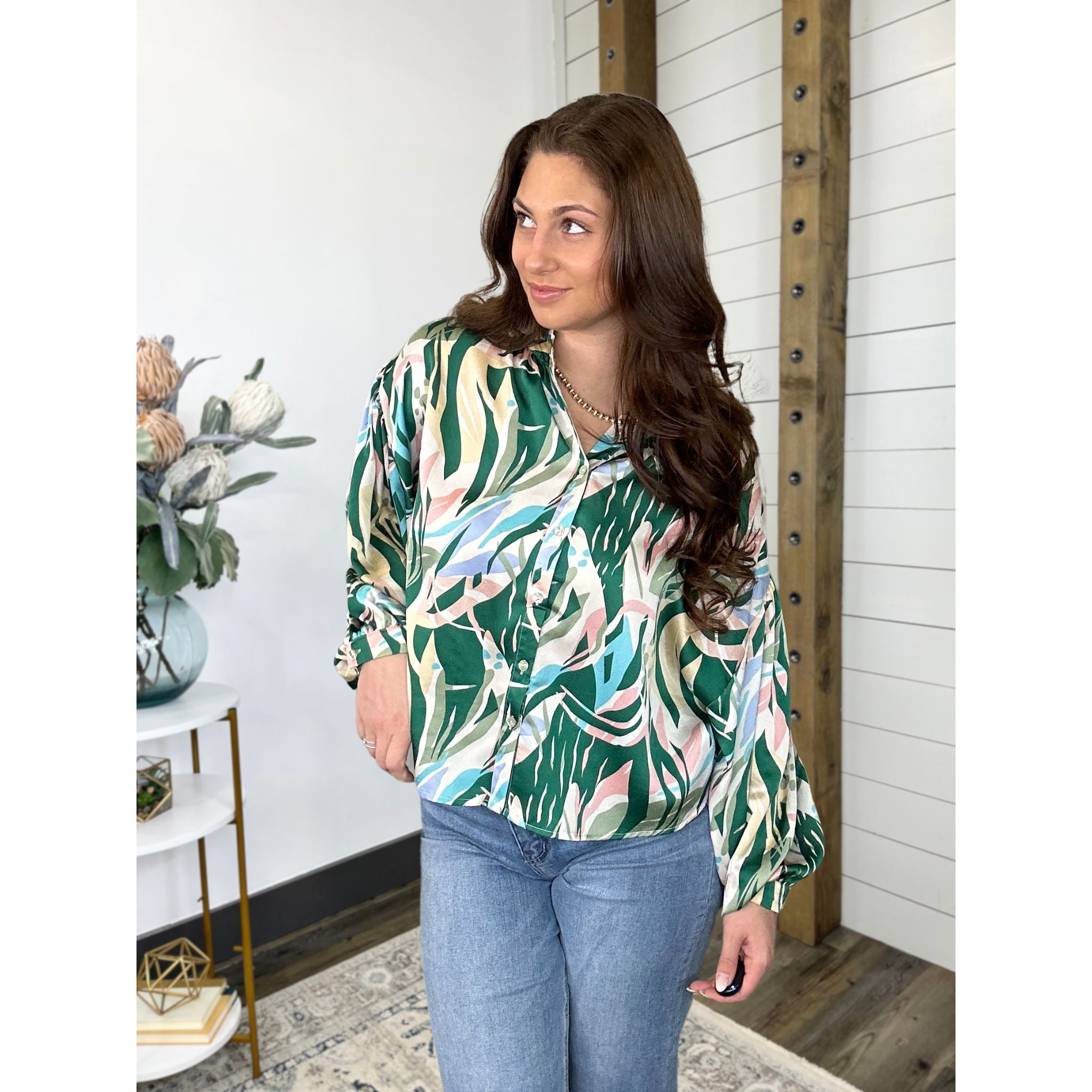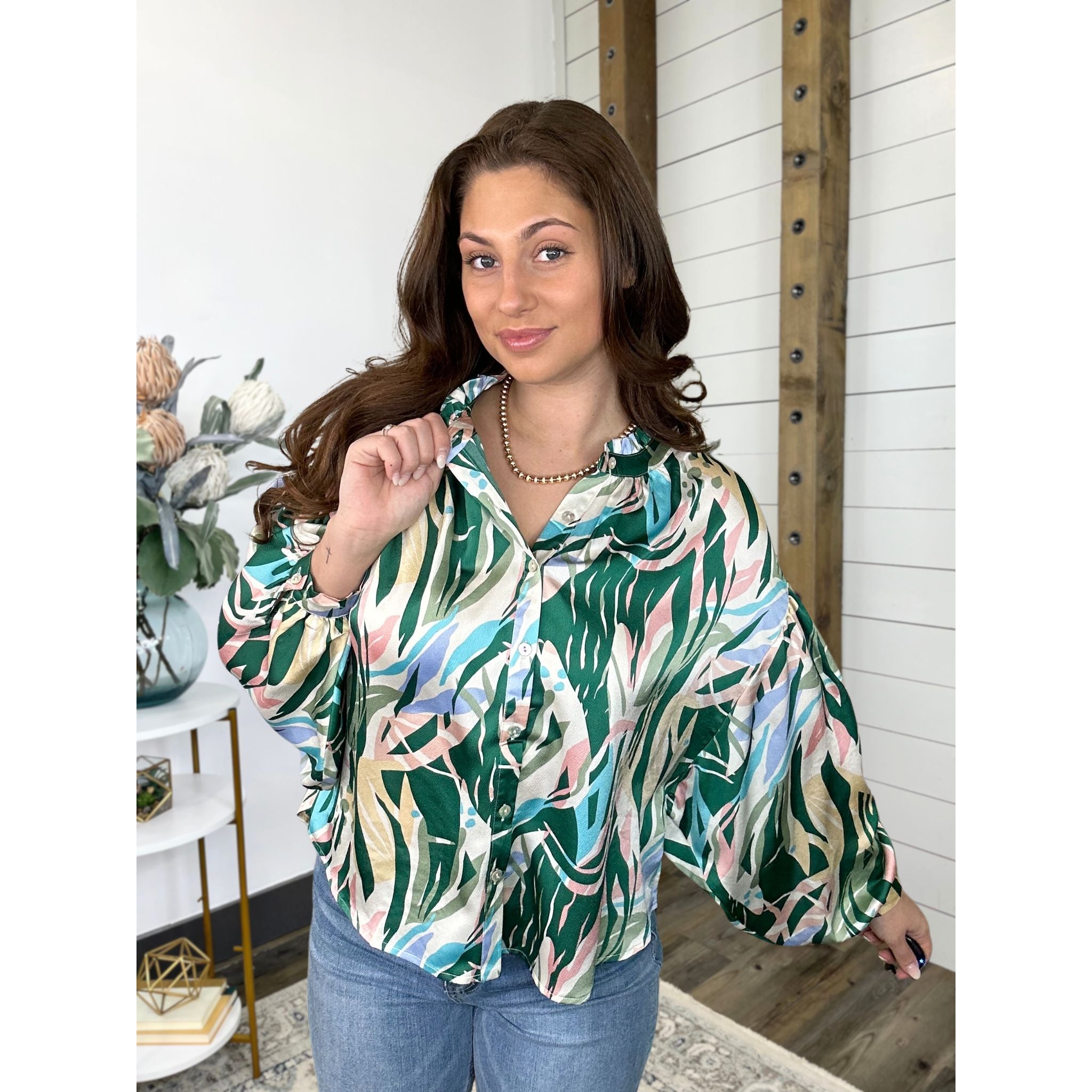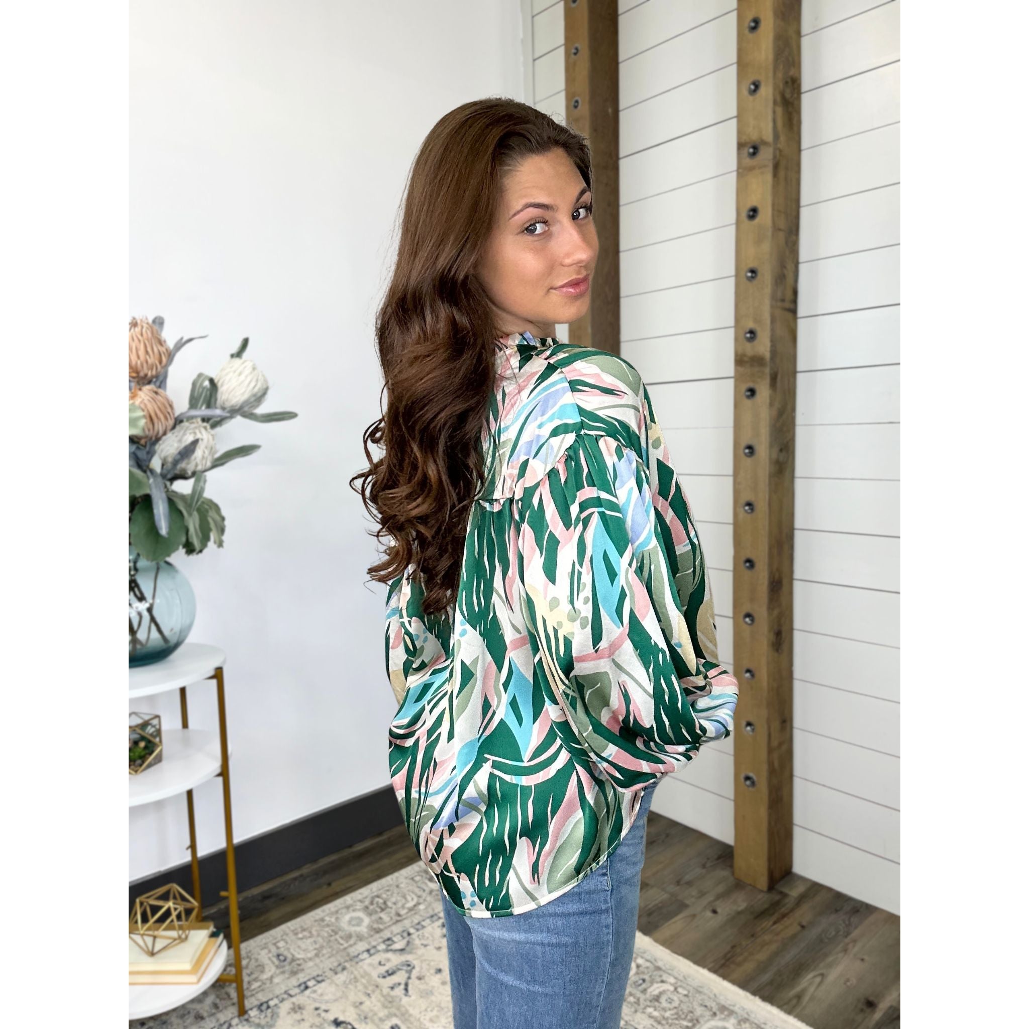 Long Dolman Sleeve Frill U Neck Button Down Print Top Featuring Button Cuffs and Back Shirring