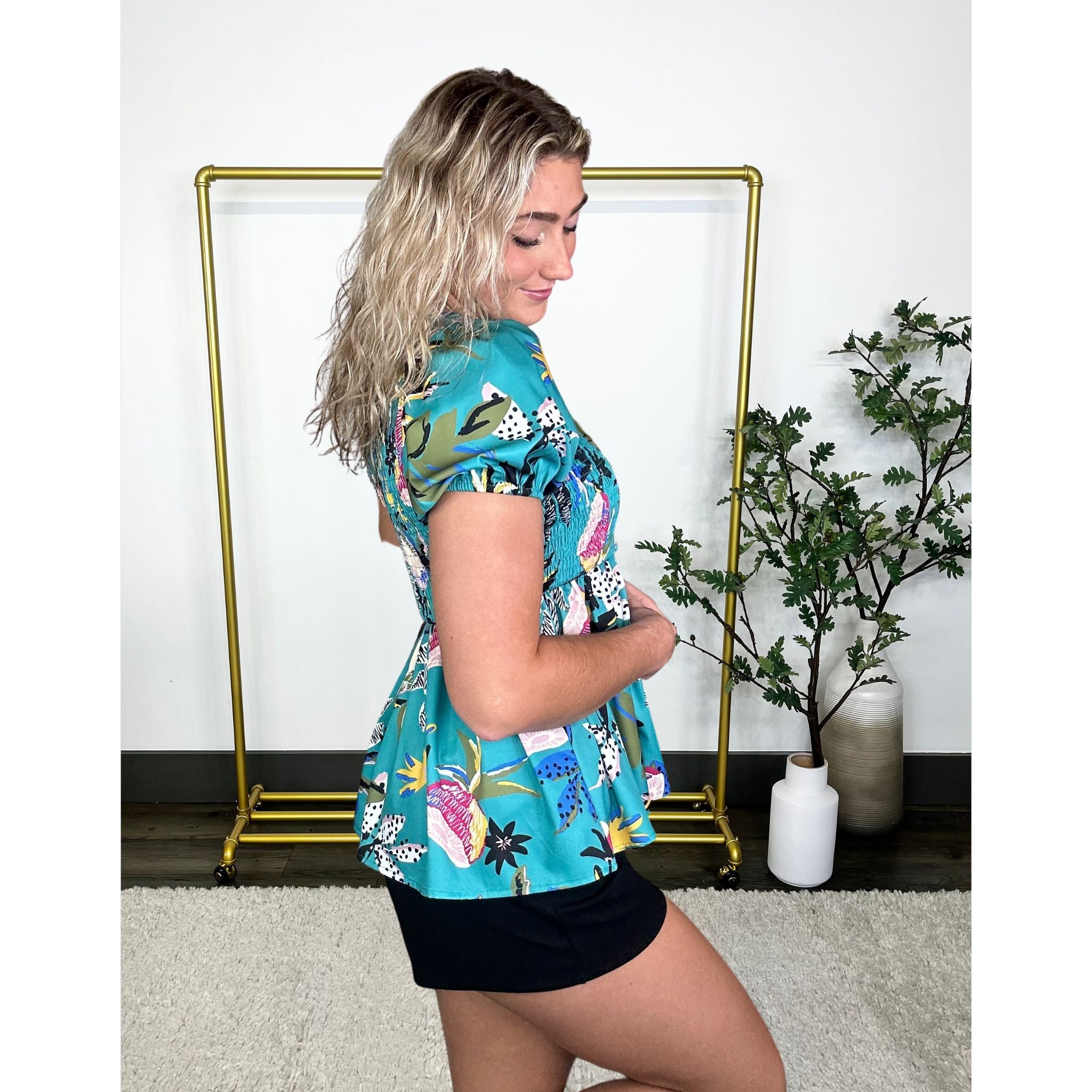 Look stunning in the Paradise Awaits Asymmetrical Babydoll Top. This top is designed to flatter, with its bold tropical print and slightly curved hemline. Perfect for any occasion!