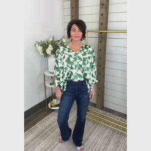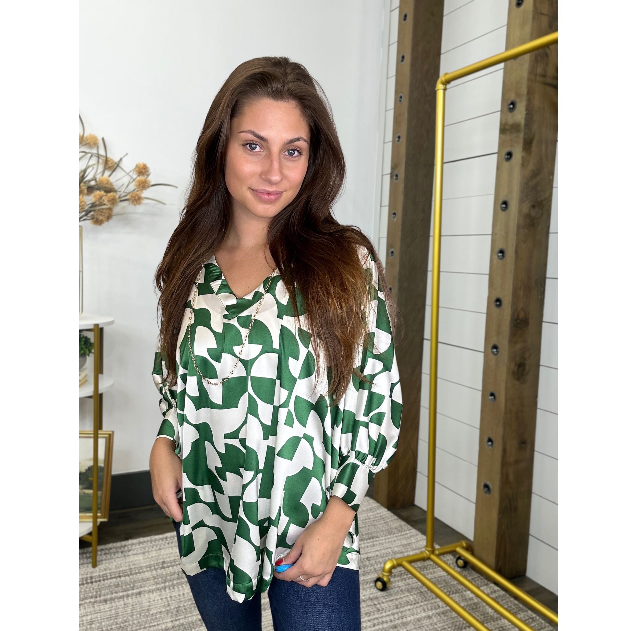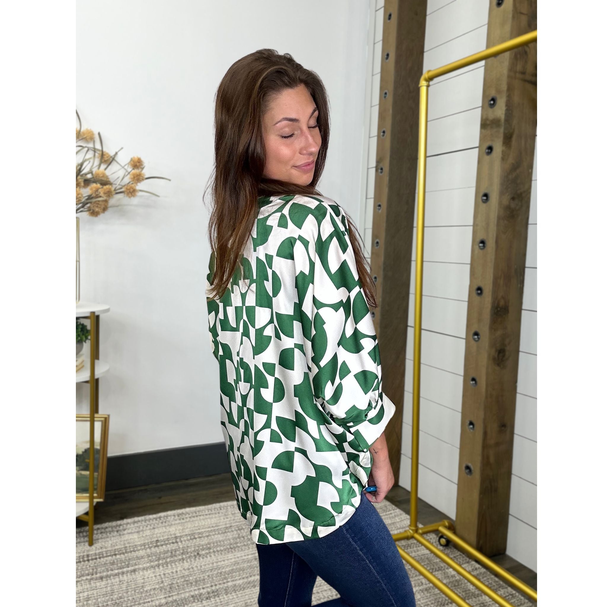 Half Dolman Button Cuff Sleeve V Neck Geometric Print Top Featuring Round Hem