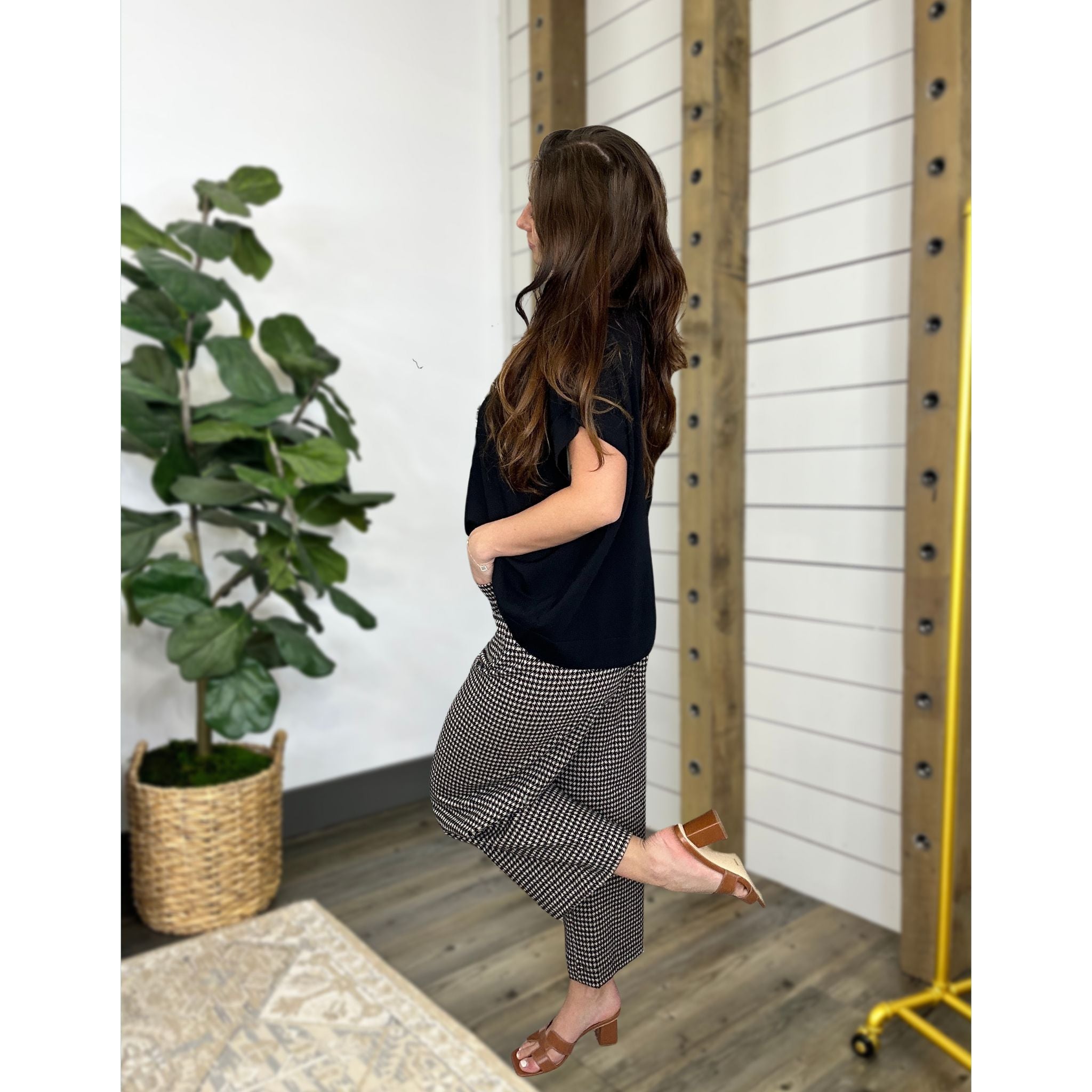 Pull On High Rise Houndstooth Print Wide Leg Pants Featuring Elastic Back Waistband and Front Patch Pockets