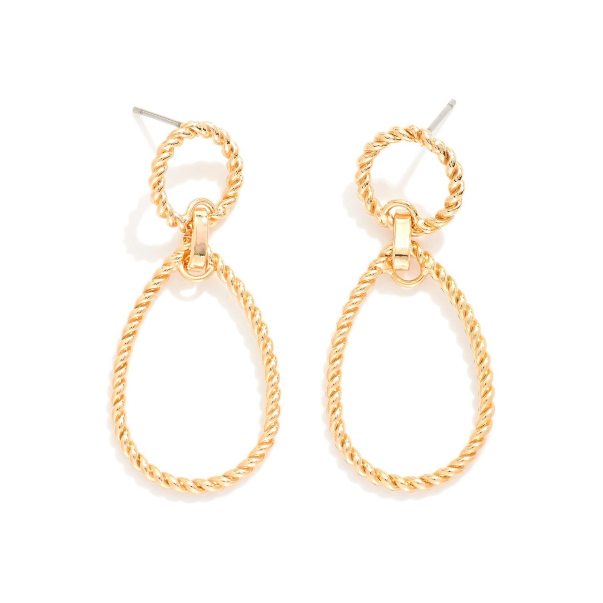 Linked Twisted Metal Circle & Teardrop Post Drop Earrings- Approximately 1.5" L