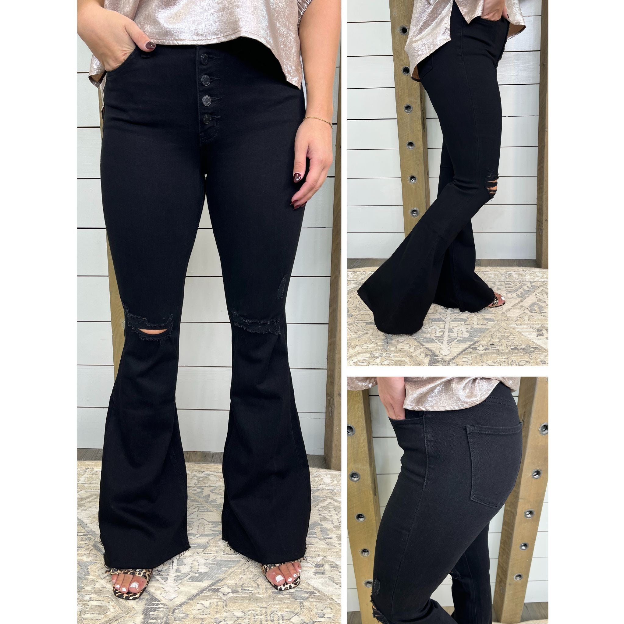 Mid Rise Button Up Comfort Stretch Flare Jeans Featuring Distressed Knees and Raw Edge Hem