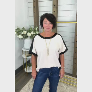 Short Dolman Sleeve Boat Neck Top Featuring Solid Stripe Edge, Back Keyhole Closure, & Side Slits