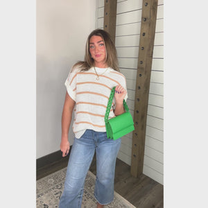 Short Dolman Sleeve Round Neck Stripe Knit Sweater Featuring Ribbed Hem