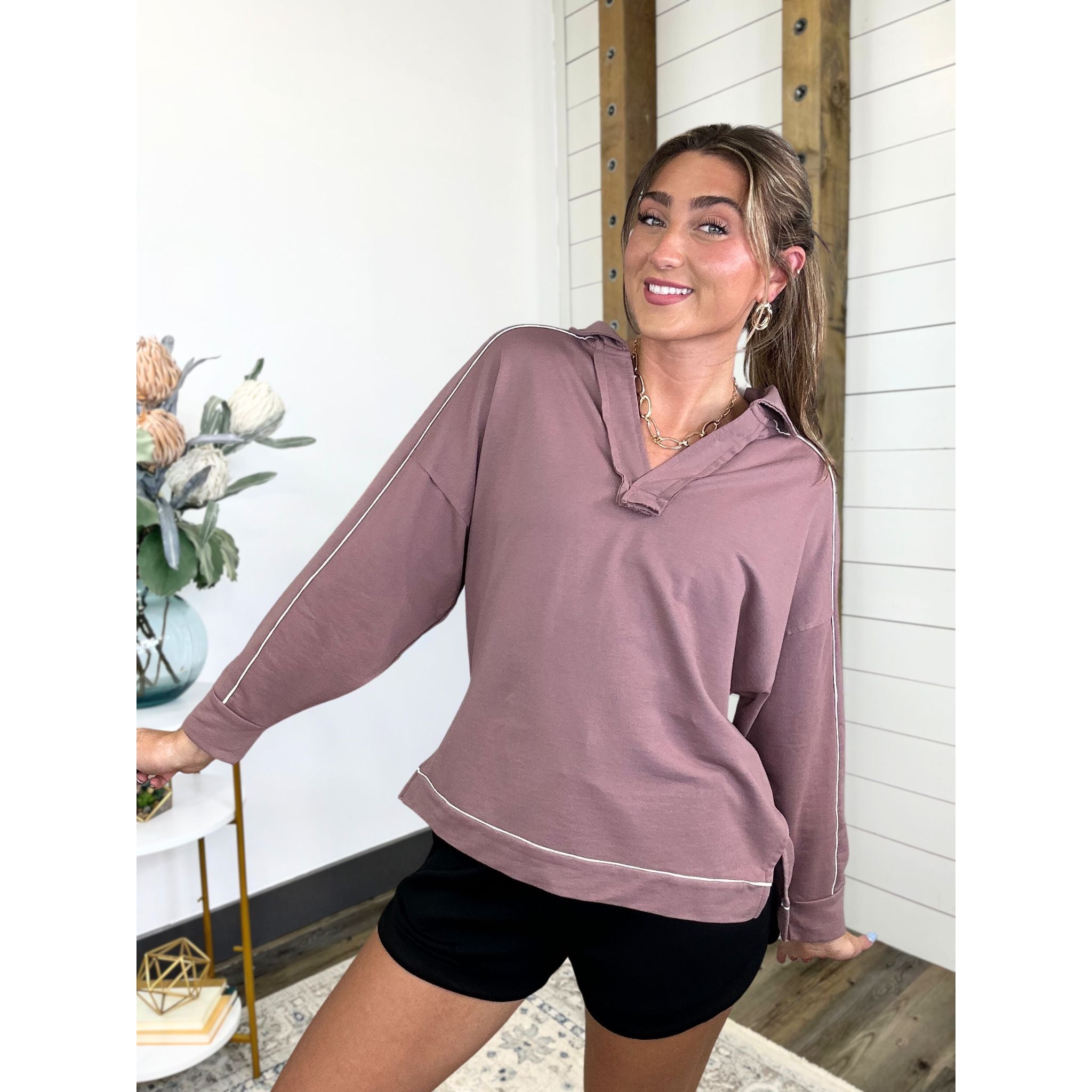 Long Sleeve Drop Shoulder Collared Pullover Top Featuring Contrast Piping, Raw Edge Details, & Side Slits