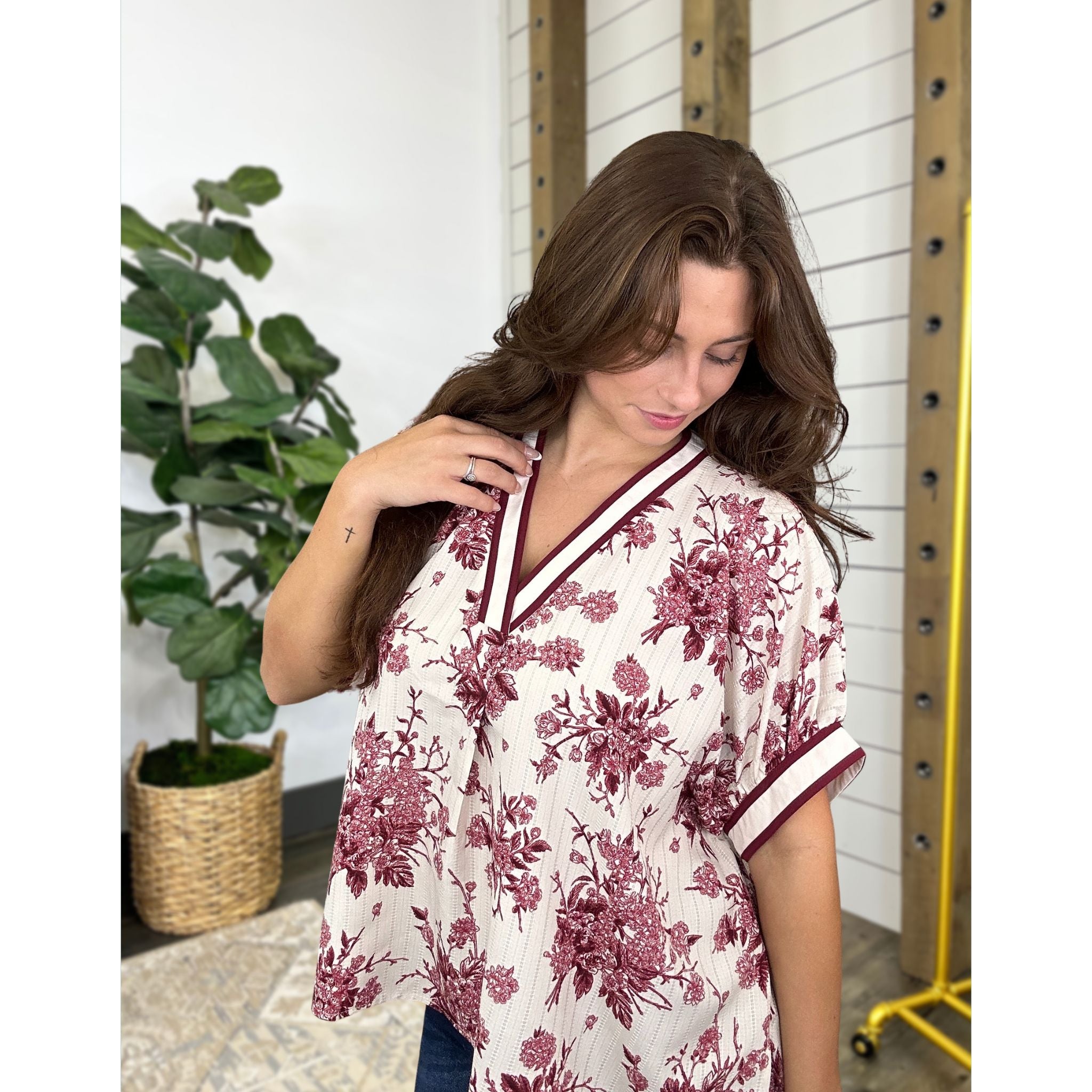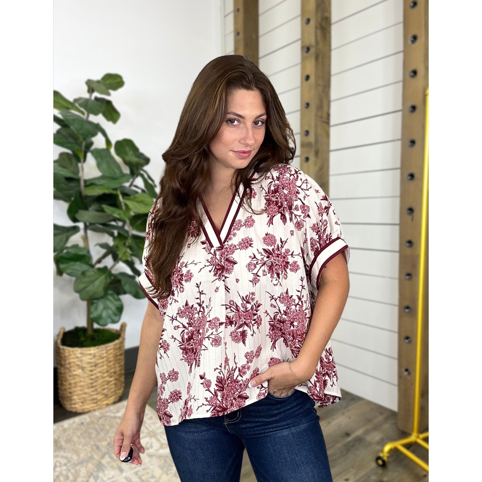 The Crimson Harvest Top pairs your favorite fit with a dreamy burgundy floral print. With chic details and effortless style, it’s perfect for adding a pop of personality to any outfit.