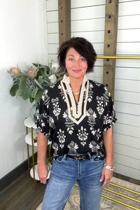 Half Elasticized Dolman Sleeve V Neck Floral Print Top Featuring Contrast Stripe Neckline Trim