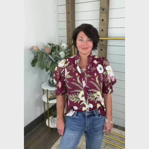 Short Puff Sleeve Ruffle Neck Floral Button Down Top Featuring Pleating Detail on Sleeve and Back