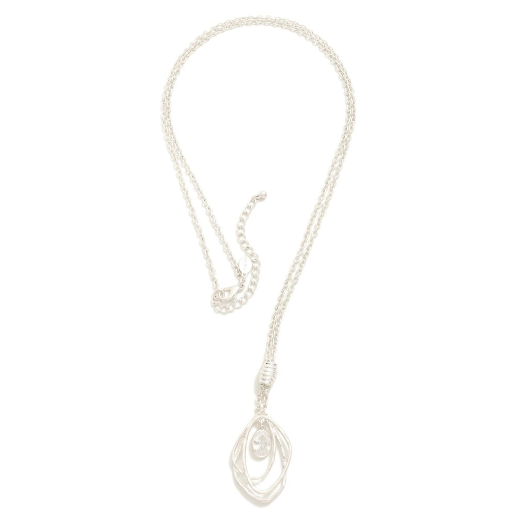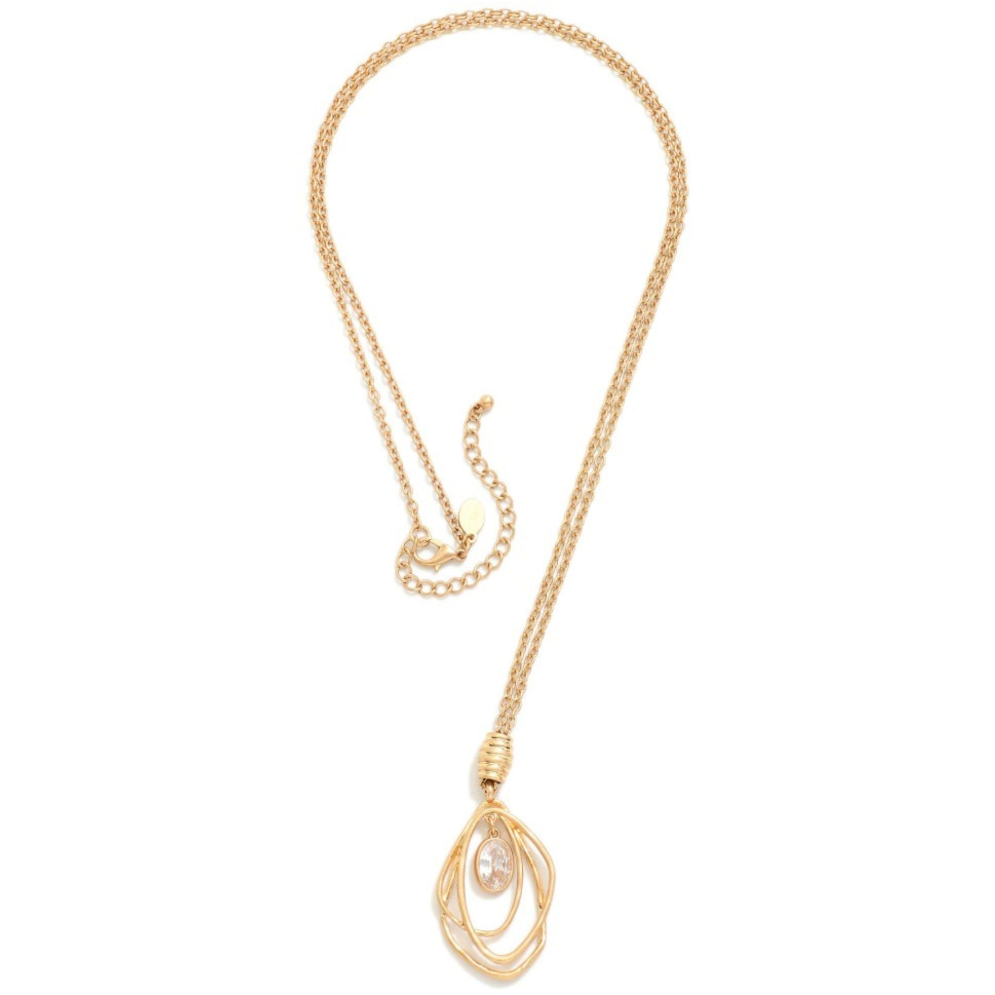 Long Chain Link Necklace Featuring Layered Metal Tone Geometric Shapes & Rhinestone Pendant- Approximately 30" L- Extender 3" L